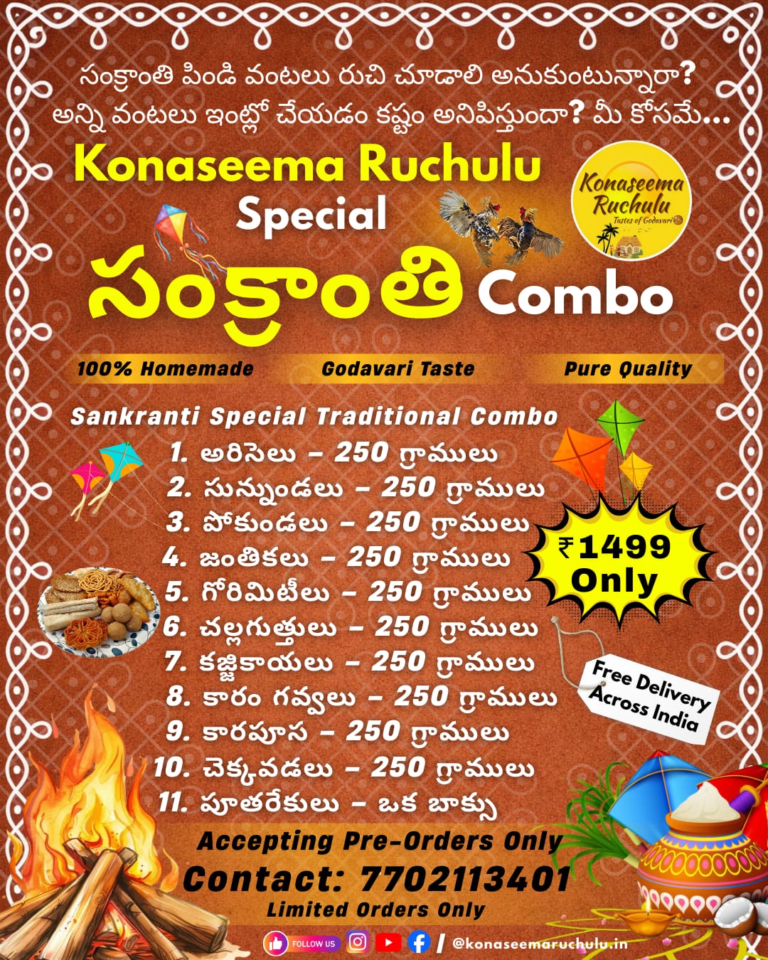 Celebrate Sankranti with our special traditional combo made with authentic Godavari recipes. 100% homemade, pure ingredients, and festive flavors delivered fresh to your home.